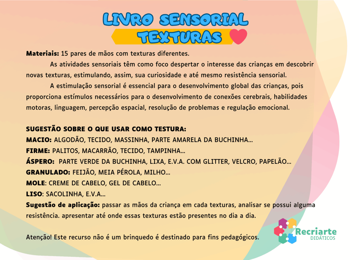 Estimular a percepção tátil e sensorial por meio da exploração de diferentes texturas, favorecendo o desenvolvimento cognitivo, motor e sensorial das crianças.
